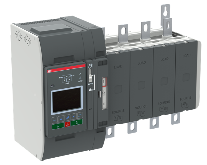 OXB400E3S3QB, TruONE ATS Seviye 3 kontrolör (LCD), Alttan giriş -Kaynak 1 ve Kaynak 2 bağlantıları altta, yük bağlantıları üstte